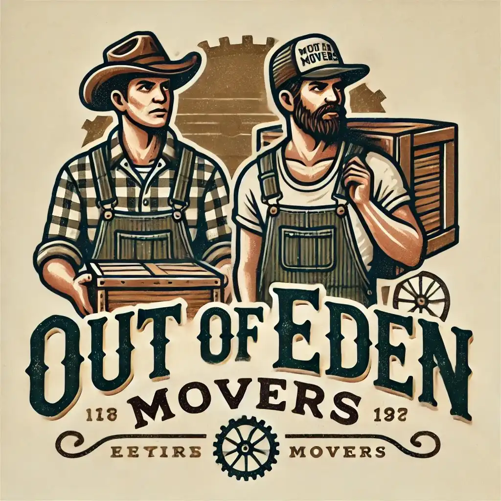 Prompt: A rustic and folksy logo for a moving company called 'Out of Eden Movers.' The design features two cartoon mascots who are brothers, each with a slightly contrasting demeanor to suggest they are subtly at odds with one another. One brother appears meticulous and serious, carrying a neatly packed box, while the other is laid-back, holding a slightly askew bundle of belongings. Both wear overalls and trucker hats, with details like plaid shirts and scuffed boots for a rustic charm. The background includes subtle elements like a wagon wheel or wooden crate. The typography is vintage-inspired, with 'Out of Eden' in bold, weathered lettering and 'Movers' in a smaller, complementary script. Earthy tones like deep green, brown, and beige are used to evoke a folksy, trustworthy vibe. | |