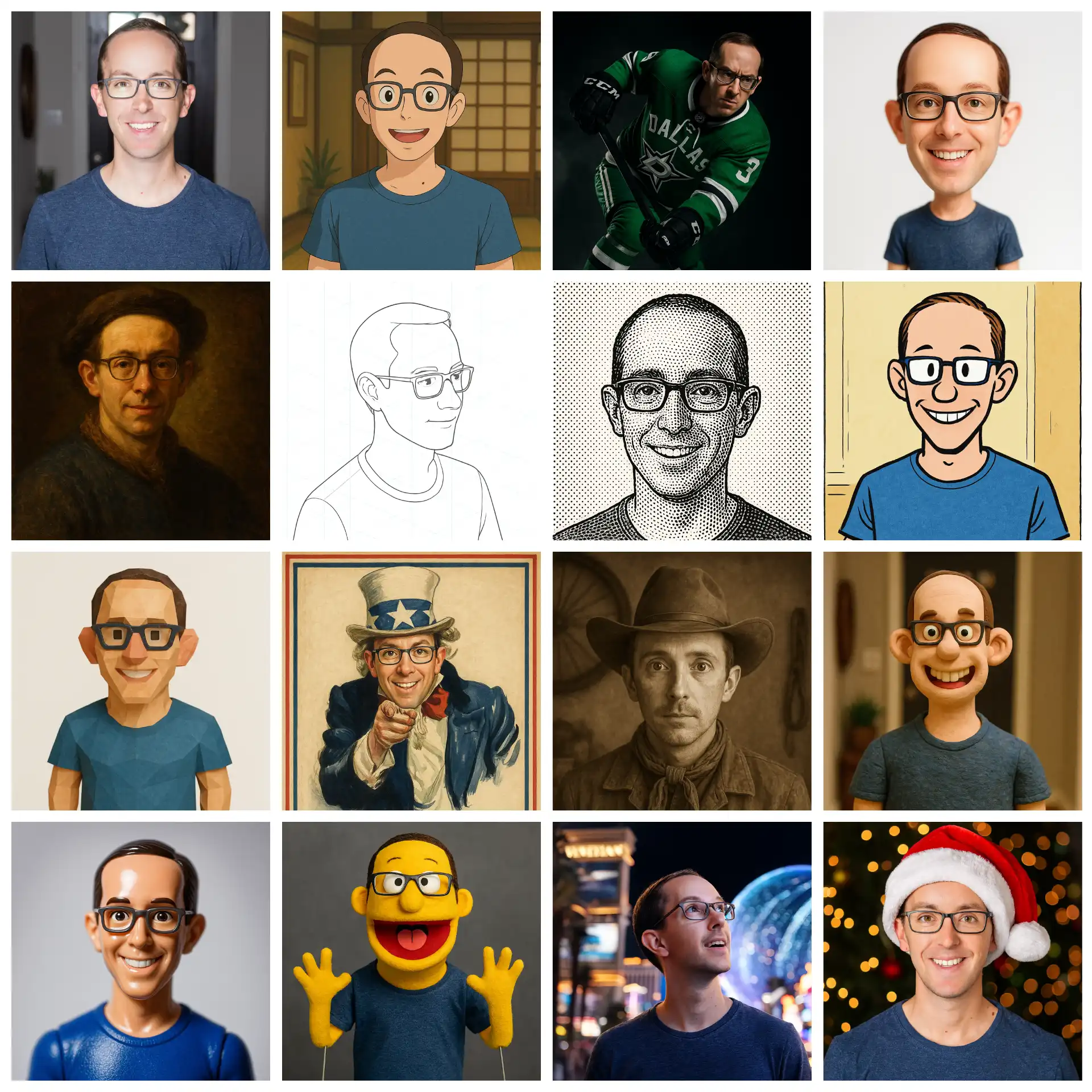 Throughout the year, I made a variety of AI-generated riffs on my real headshot to use as my Slack profile picture. Even here, you can see an evolution in quality from the âStudio Ghibliâ trope all the way to a photorealistic Christmas card: