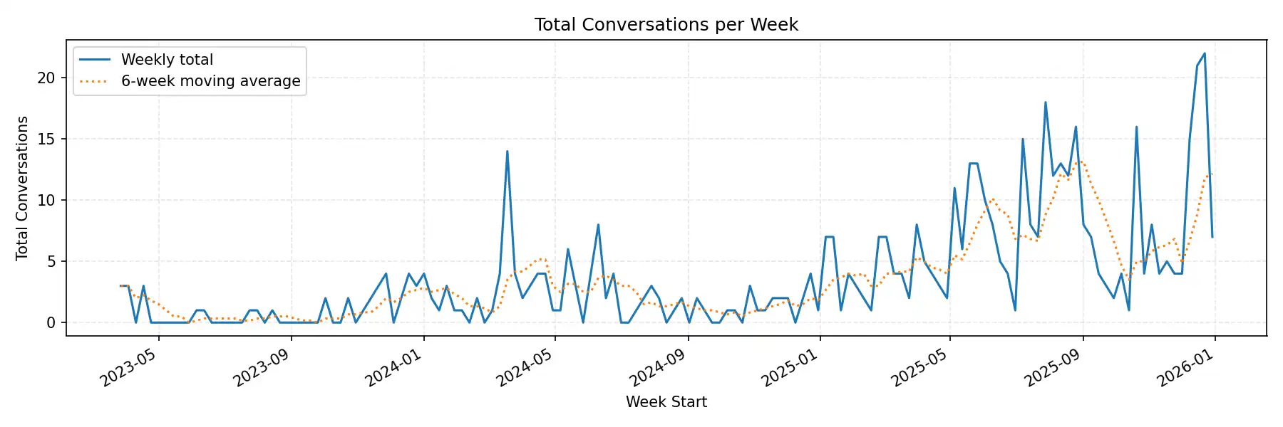 Personally, 2025 marked the first year that I truly adopted AI as a core part of how I work, integrating it into my daily processes in both my personal and professional life, and writing LLM-powered code myself. I've been playing around with ChatGPT since it came out in 2023, but you can see how my weekly usage steadily increases during 2025, after being mostly flat the two years prior: