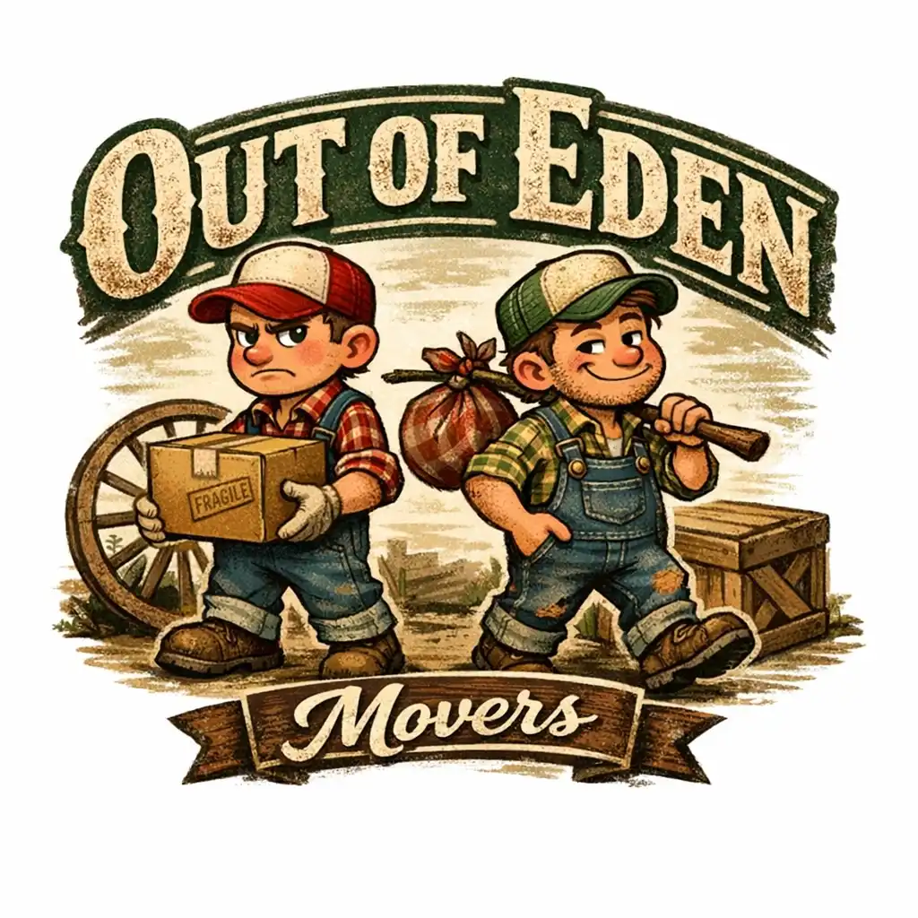 Prompt: A rustic and folksy logo for a moving company called 'Out of Eden Movers.' The design features two cartoon mascots who are brothers, each with a slightly contrasting demeanor to suggest they are subtly at odds with one another. One brother appears meticulous and serious, carrying a neatly packed box, while the other is laid-back, holding a slightly askew bundle of belongings. Both wear overalls and trucker hats, with details like plaid shirts and scuffed boots for a rustic charm. The background includes subtle elements like a wagon wheel or wooden crate. The typography is vintage-inspired, with 'Out of Eden' in bold, weathered lettering and 'Movers' in a smaller, complementary script. Earthy tones like deep green, brown, and beige are used to evoke a folksy, trustworthy vibe. | |